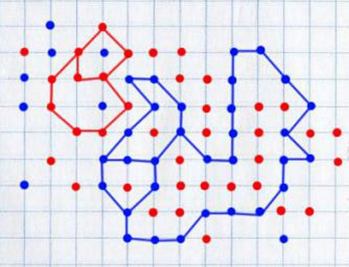 Стратегия на бумаге – игра для тебя и твоего соседа по парте. Реквизит: 2 листка в клетку и 2 ручки с пастой разного цвета. Правила игры: игроки поочередно ставят токи на пересечении линий клетки и по этим точкам создают непрерывную область «своего» цвета, при этом в область окружения ставить точки запрещено и одному, и другому игроку. Цель: создание большего количества таких замкнутых областей.