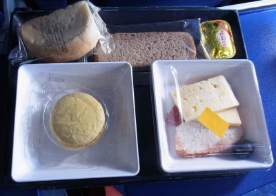 Кусочек чёрного хлеба, микро-булочка белого, сливочное масло, печенька. В основной коробочке два кусочка сыра, два кусочка разной ветчины и одинокая оливка. При всей своей нелюбви к Аэрофлоту должен признать одно — по качеству пищи в моем личном рейтинге авиакомпаний Аэрофлот уверенно делил первое место с немецкой Люфтганзой, на обед всегда были горячие блюда. Это был первый мой рейс за много лет, когда пища разочаровала.