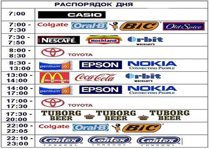 Многие пользователи Интернета прекрасно осознают связь между рекламным интересом и телевизионным контентом: реклама первична, всё остальное – производное от неё. С этой точки зрения характерна карикатура, на которой изображена программа некоторого условного телеканала (см. рис.4). Заданы интервалы времени, но только вместо привычных названий программ вписаны логотипы ведущих мировых брендов – «Касио», «Колгейт», «Орбит» и т.п. Как ещё раз не вспомнить телезрителя, для которого телевидение – это поток рекламы с редкими перебивками в виде обрывков фильмов и телепередач.