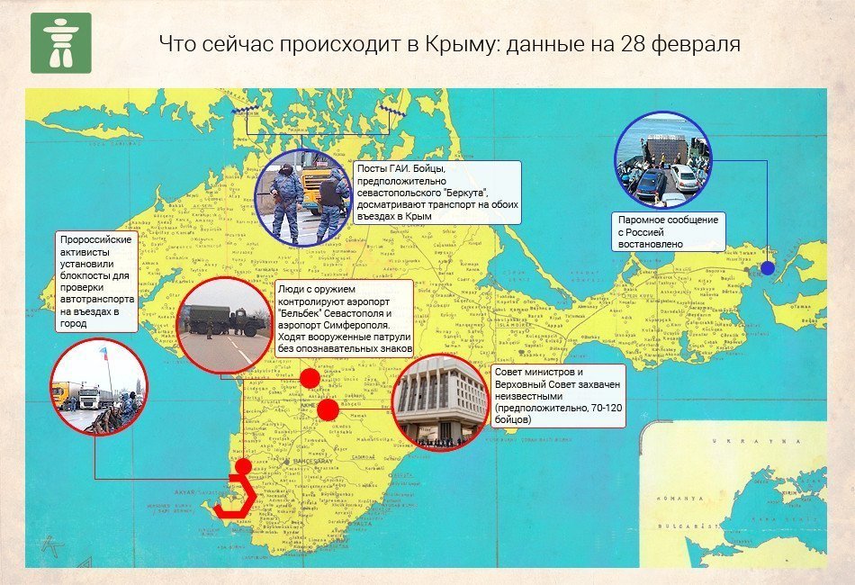 Перед этим в Крыму произошло то, что напоминает «киевский вариант» с точностью до наоборот. Вооруженные люди, представившиеся силами самообороны русскоязычных граждан Крыма, заняли здания Верховной Рады и Совета Министров республики, подняв над ними российские флаги.