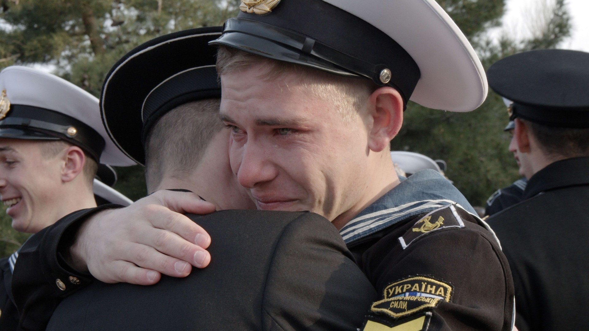 Курсант-украинец, покидающий вместе с товарищами Нахимовское военно-морское училище в Севастополе, прощается с однокурсниками-россиянами перед отъездом в Одессу.