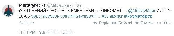 Напомним, вооруженные столкновения народного ополчения с украинскими военнослужащими под Славянском 3 и 4 июня шли практически без перерывов. 5 июня украинские военные возобновили обстрел поселка Семеновка, по которому в предыдущие дни наносились авиаудары, в Славянске при обстреле начался пожар на заводе «Капахим» и возник риск выброса вредных веществ.
