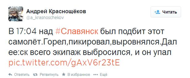 «В 17:04 над #Славянск был подбит этот самолет. Горел, пикировал, выровнялся. Далее ск всего экипаж выбросился и он упал», — сообщает пользователь Андрей Краснощеков.
