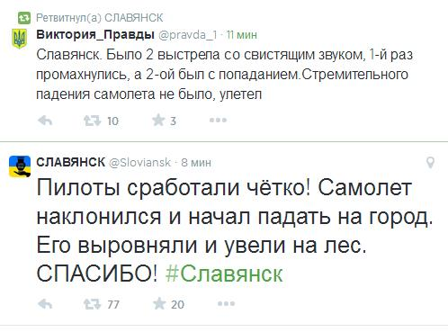 «Пилоты сработали четко! Самолет наклонился и начал падать на город. Его выровняли и увели на лес. Спасибо!», — пишут в группе Славянск.