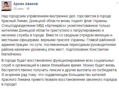 Министр МВД Арсен Аваков сообщил, что в самое ближайшее время в Красном Лимане будет восстановлено функционирование всех социальных служб и организаций. Об этом он написал на странице в Facebook.