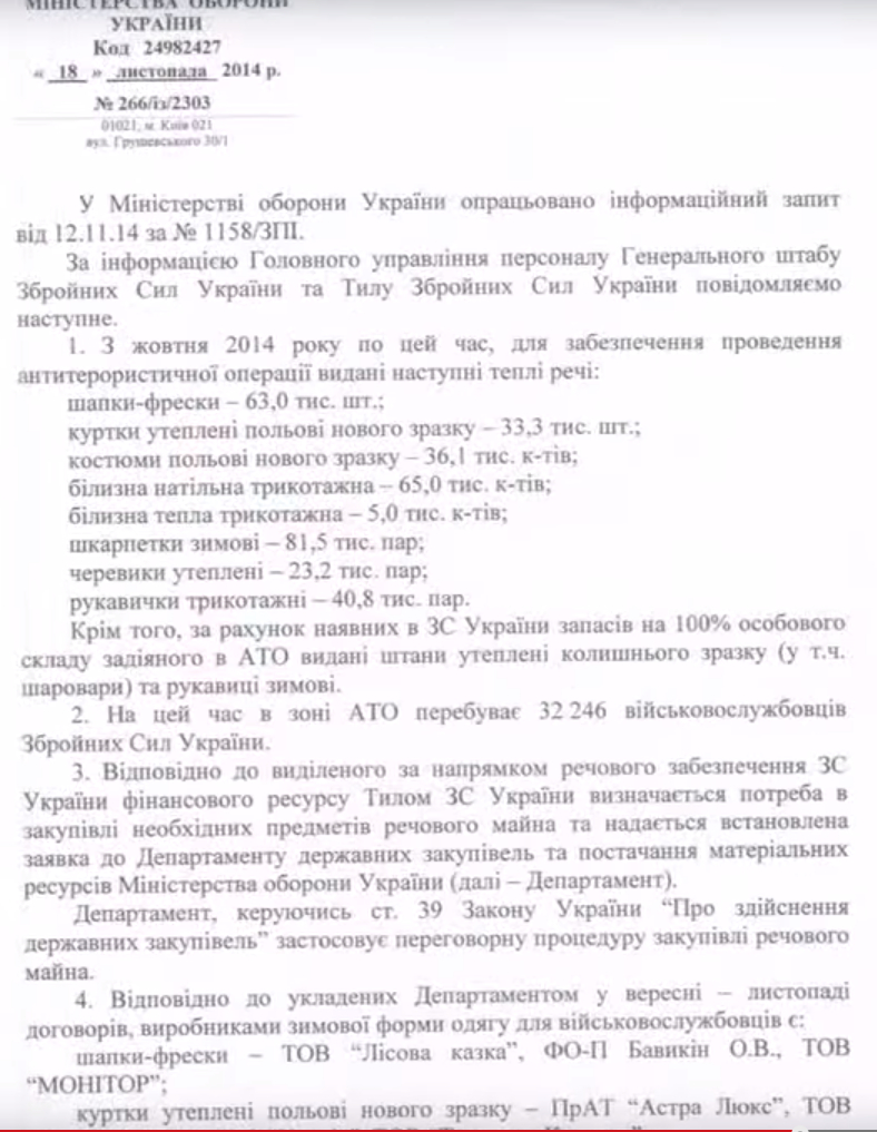 Любопытный документ был продемонстрирован в сюжете украинского 17 канала, в котором речь шла об обеспечении украинских военных зимней формой одежды.
