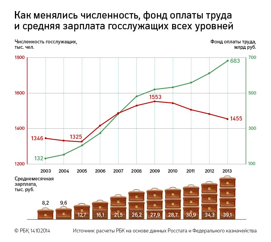 Несмотря на снижение численности госслужащих, совокупные расходы на бюрократию выросли, говорит официальная статистика. Если в 2009 году совокупные расходы на оплату труда занятых в госуправлении составляли 519,3 млрд руб., то в 2013-м – 682,7 млрд руб. Рост, таким образом, составил 31%, говорят данные Росстата.