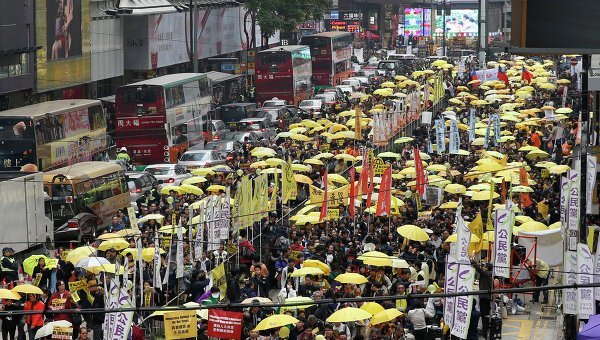Несколько тысяч активистов вышли на улицы Гонконга с плакатами и желтыми зонтами, чтобы принять участие в первой в этом году акции протеста за демократизацию выборов.