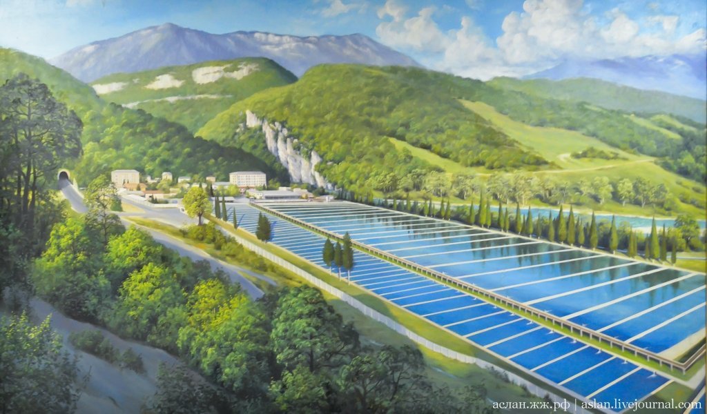Когда мы зашли на предприятие, то увидели такую картину: водоемы накрытые сеткой, и вода сливающаяся из них по искусственному каналу в реку Мзымта.