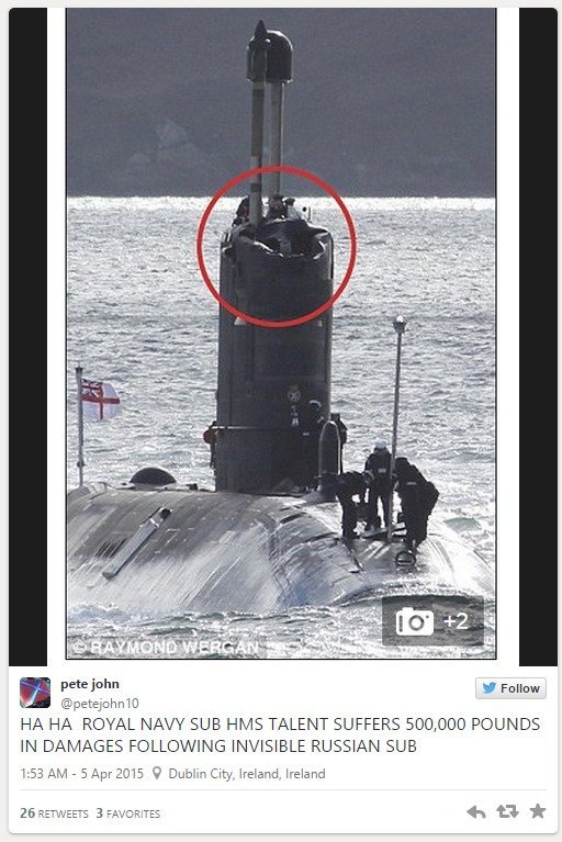По данным газеты, при обследовании повреждений экипаж HMS Talent обнаружил, что пострадала звукоизолирующая облицовка. Издание отмечает, что во время холодной войны британский флот нередко называл столкновение со льдами причиной повреждения кораблей. Однако иногда выяснялось, что поломки были вызваны столкновениями с военными кораблями других стран.