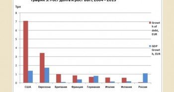 На графике 3 показано, насколько аккумулирование долга в западных странах превышает официальный показатель темпов прироста ВВП. За период 2004 — 2013 гг. безусловным лидером в росте долгового бремени стали США — добавившие к нему $9,8 трлн долларов (7 трлн евро, как показано на графике). За этот период рост государственного долга в США превысил рост ВВП в 5 раз (500%). На графике 4 это показано путём сравнения соотношения между темпами роста долга и темпами прироста ВВП.
