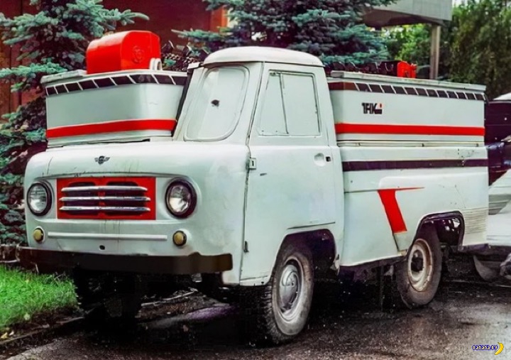 Это самодельная машина для заливки льда на хоккейной арене. Создана на базе УАЗ-452. Совершенно дикое решение, потому что управление из кабины перенесено в заднюю часть кузова, где сидит оператор. И для того, чтобы рулить, от нового руля к старому просунули что-то вроде системы валов. Примечательно, что всё это вполне сносно работало и рулилось.