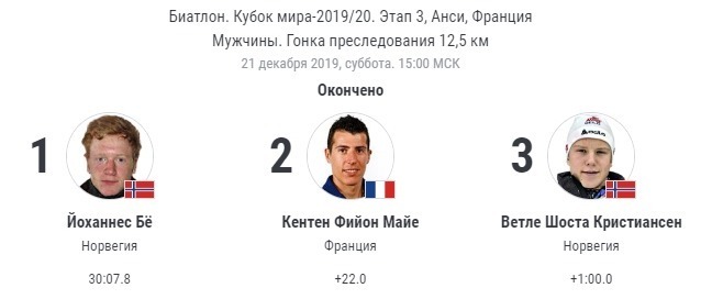 Тогда лучшее время среди наших соотечественников показал Александр Логинов, ставший вторым. Первое место завоевал норвежец Йоханнес Бё, француз Эмильен Жаклен взял третье место.