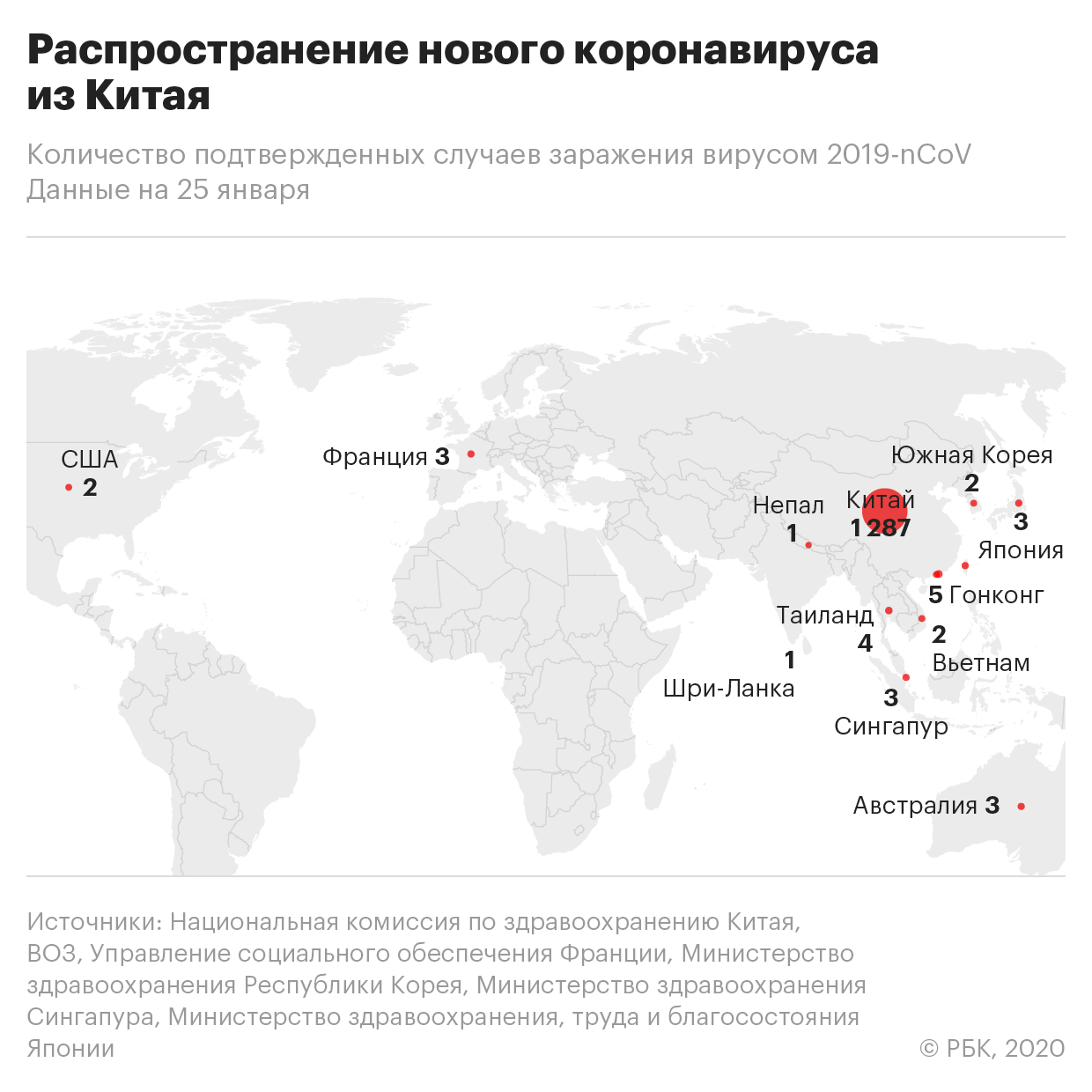 Вспышка коронавируса 2019-nCoV началась в китайском городе Ухань в декабре прошлого года. Случаи заражения подтвердили в 20 странах, включая США, Таиланд, Японию, Францию, Финляндию, Германию, Австралию, Непал, ОАЭ и Филиппины.