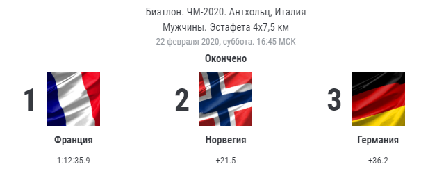 - Биатлон Чемпионат мира: Эстафета, мужчины — 22.02.2020 смотреть онлайн видео результаты