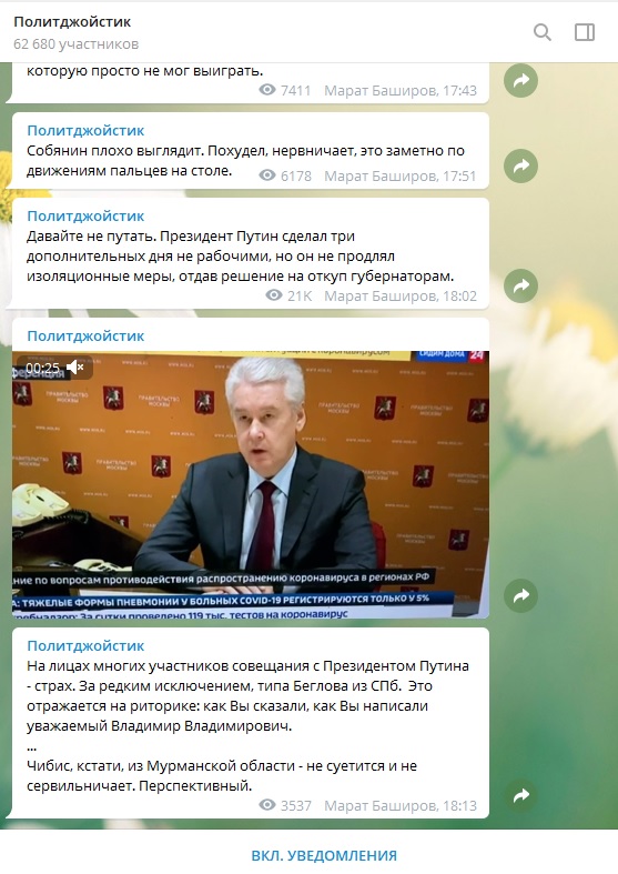 Пока Владимир Путин зачитывал своего рода обращение к нации в первые минуты совещания с губернаторами и членами кабмина, нашлись те, кто отвлёкся на свои дела. Между тем, политолог Марат Баширов продолжал считывать знаки.