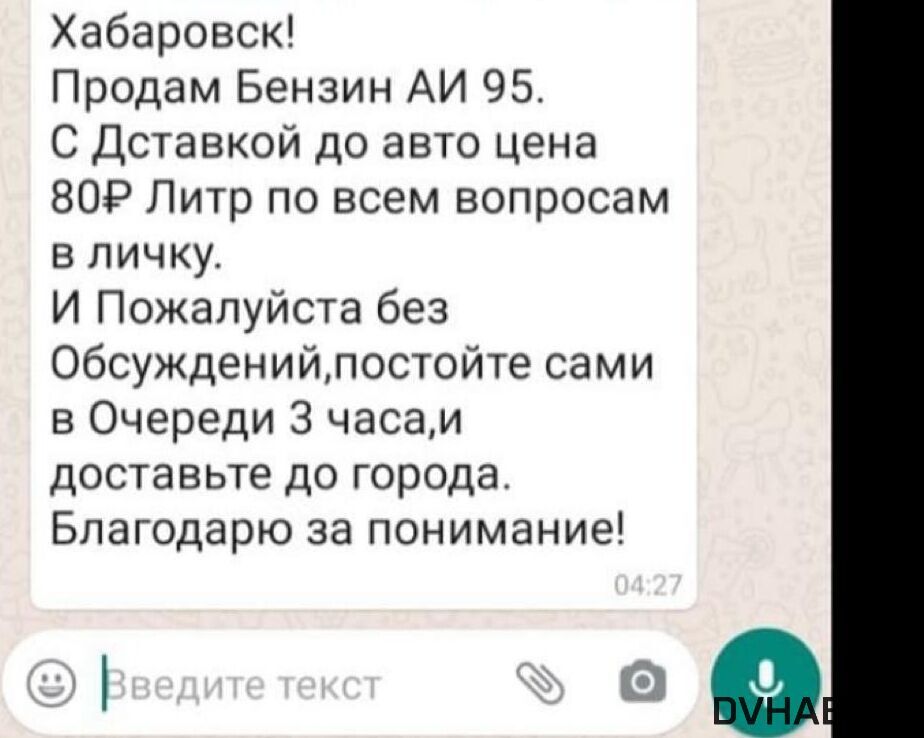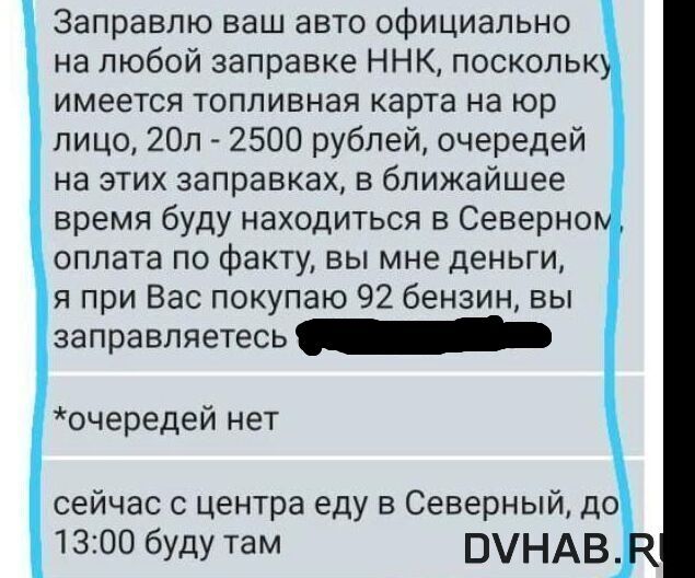 На заправках ННК купить АИ-95 и АИ-92 практически невозможно без топливной карты, а на АЗС “Роснефть” и “Ресурснефть” бензовозы уже не успевают подвозить столько горючего, чтобы хватило всем автолюбителям города. Очереди есть даже на тех заправках, где в докризисное время всегда было пусто. Результатом этого стало появление спекулянтов, которые начали предлагать свои услуги в хабаровских пабликах и соцсетях.